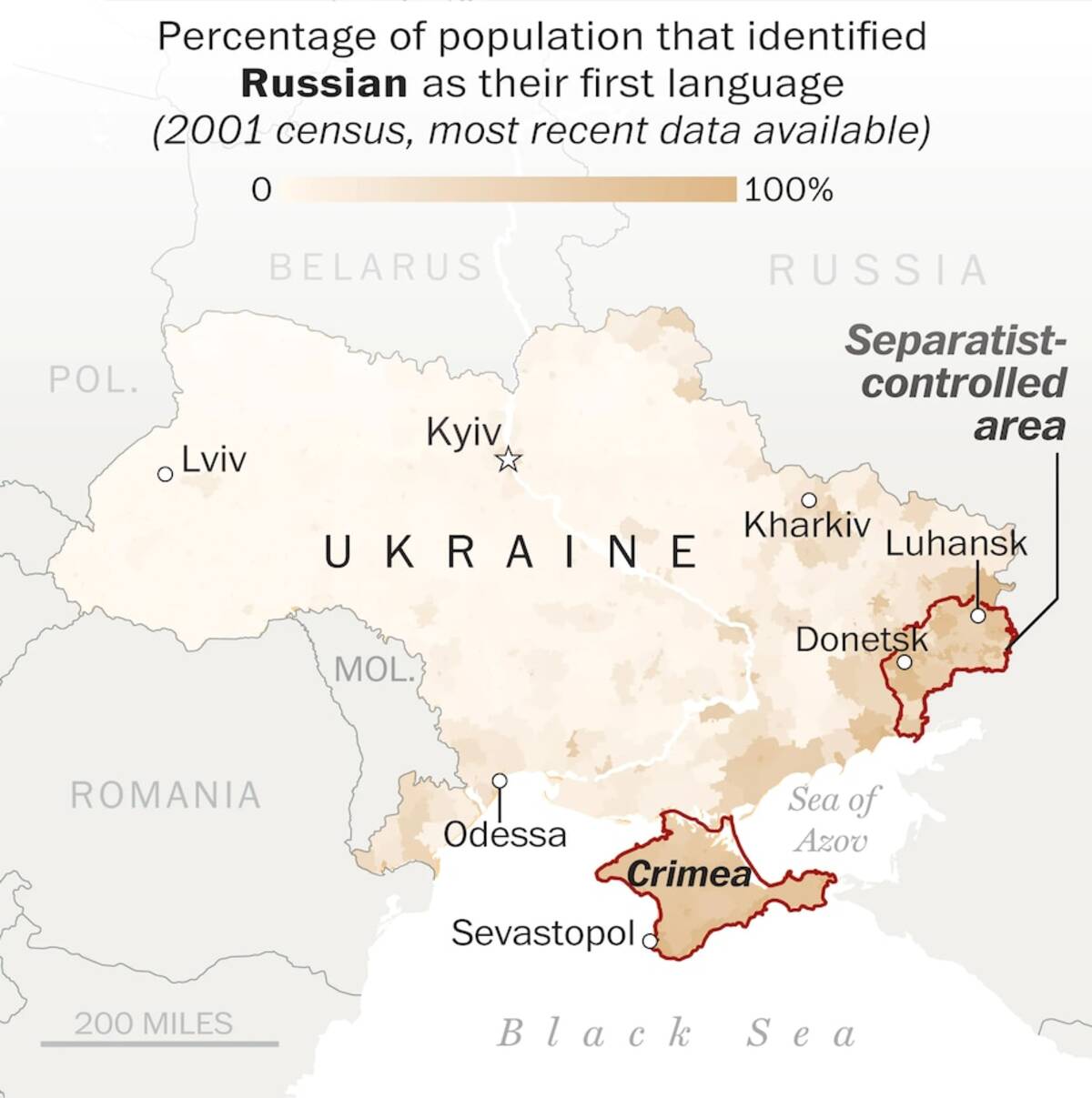 - "The most recent official census, in 2001, found that more than half of the population in Crimea and Donetsk identified Russian as their native language. Separatist rebels have capitalized on Donbas's distinctive regional identity to fuel support and rebellion against Kyiv. Moscow, too, has used this identity, and further laid the groundwork for it by issuing passports, as a pretext to send in forces to 'defend' people."