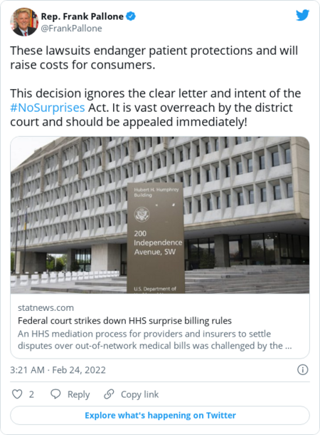 | Meanwhile, in the courts… | | In a win for providers, a federal judge struck down a controversial facet of the federal health department's rule shielding patients from the sky-high cost of surprise medical bills. Multiple lawsuits from providers targeted the amount a mediator considers for insurers to pay doctors when resolving billing disputes. A Trump-appointed judge sided with the Texas Medical Association that argued the payment amount chosen deviated from congressional intent. | - It's the first court ruling on an issue that's divided even lawmakers who wrote the legislation. The ruling leaves in place the key consumer protections ensuring those who inadvertently seek care out of their insurance network aren't slapped with a hefty bill.